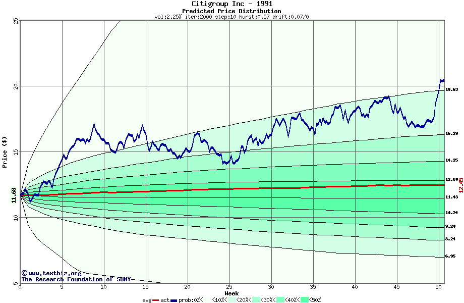 The following graph plots the year-to-date performance of the stock for 1991 compared to the probability calculated by a random walk model.