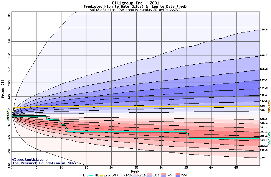 The high to date and low to date prices of the stock plotted against a random walk model for 2001 (what's this?).