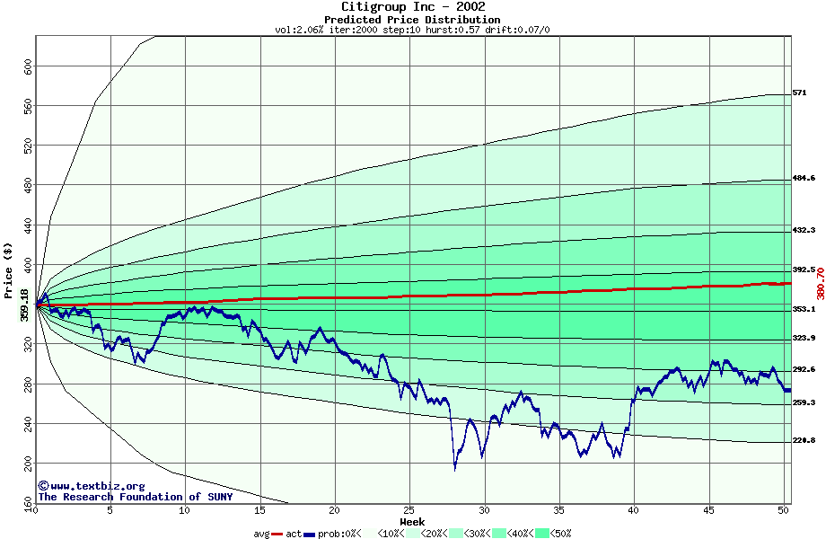 The following graph plots the year-to-date performance of the stock for 2002 compared to the probability calculated by a random walk model.