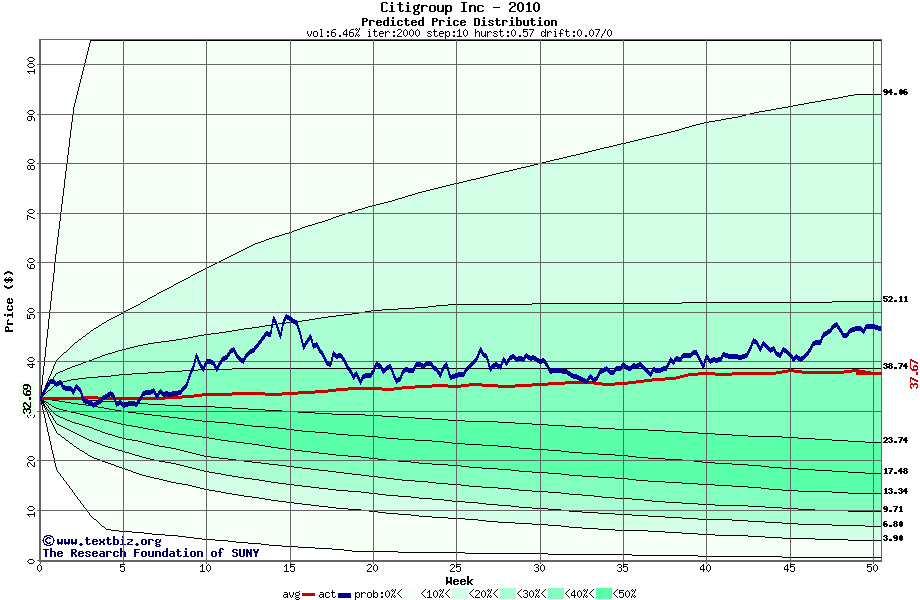 The following graph plots the year-to-date performance of the stock for 2010 compared to the probability calculated by a random walk model.
