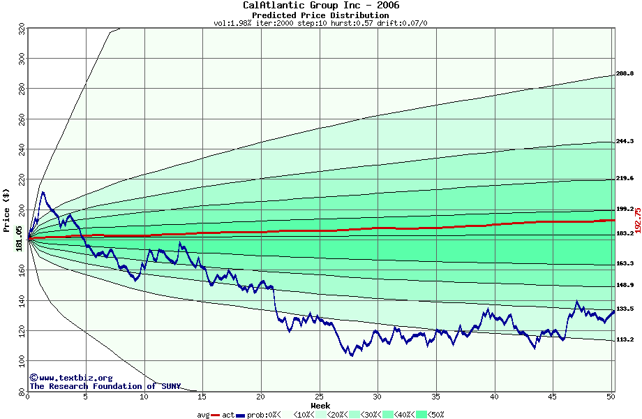 The following graph plots the year-to-date performance of the stock for 2006 compared to the probability calculated by a random walk model.
