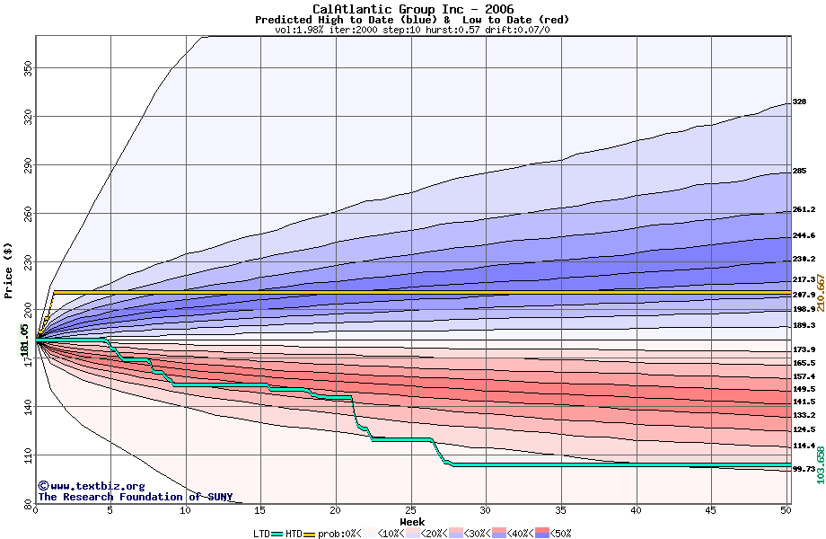 The high to date and low to date prices of the stock plotted against a random walk model for 2006 (what's this?).