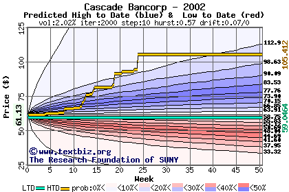 The high to date and low to date prices of the stock plotted against a random walk model for 2002 (what's this?).
