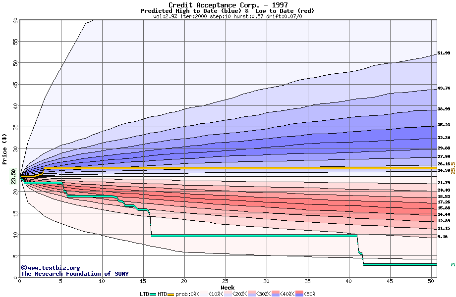 The high to date and low to date prices of the stock plotted against a random walk model for 1997 (what's this?).