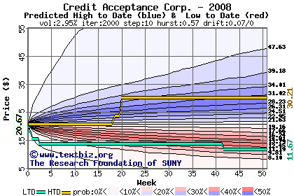 The high to date and low to date prices of the stock plotted against a random walk model for 2008 (what's this?).