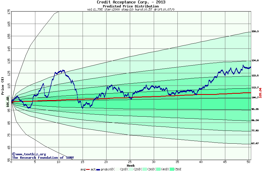 The following graph plots the year-to-date performance of the stock for 2013 compared to the probability calculated by a random walk model.
