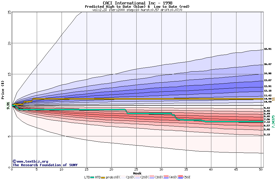 The high to date and low to date prices of the stock plotted against a random walk model for 1998 (what's this?).