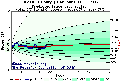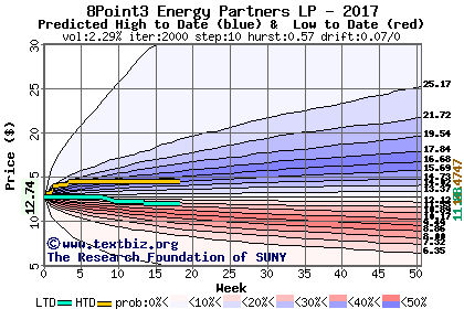 The high to date and low to date prices of the stock plotted against a random walk model for 2017 (what's this?).