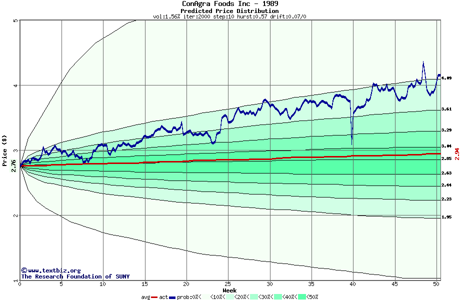 The following graph plots the year-to-date performance of the stock for 1989 compared to the probability calculated by a random walk model.