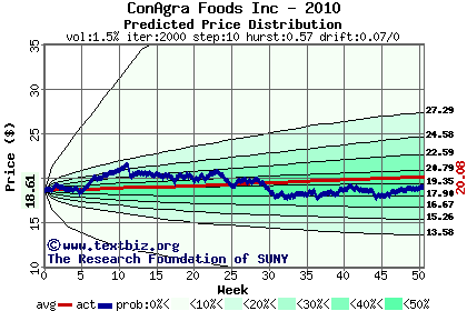 The high to date and low to date prices of the stock plotted against a random walk model for 2010 (what's this?).