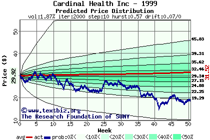 The high to date and low to date prices of the stock plotted against a random walk model for 1999 (what's this?).