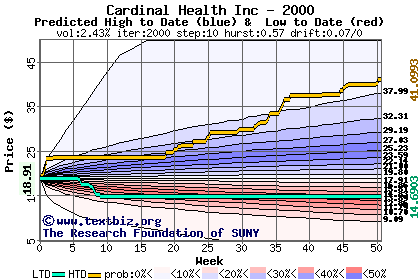 The high to date and low to date prices of the stock plotted against a random walk model for 2000 (what's this?).