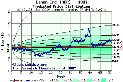 The high to date and low to date prices of the stock plotted against a random walk model for 1987 (what's this?).