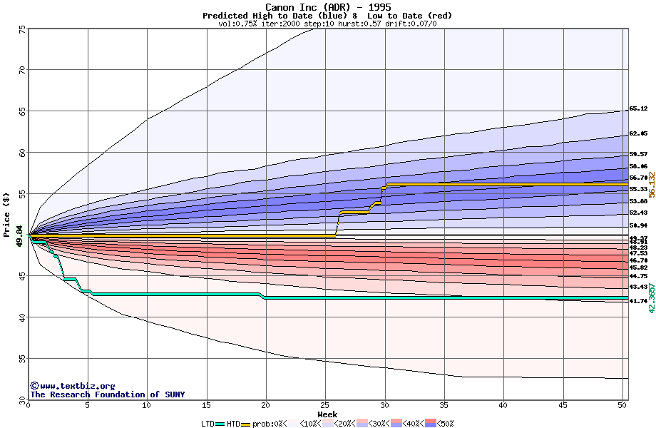 The high to date and low to date prices of the stock plotted against a random walk model for 1995 (what's this?).