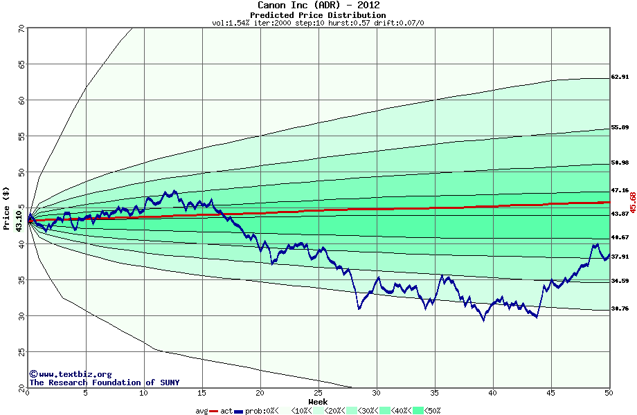 The following graph plots the year-to-date performance of the stock for 2012 compared to the probability calculated by a random walk model.