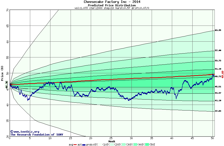 The following graph plots the year-to-date performance of the stock for 2014 compared to the probability calculated by a random walk model.