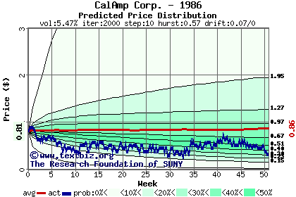 The high to date and low to date prices of the stock plotted against a random walk model for 1986 (what's this?).