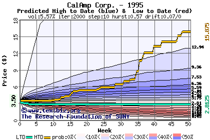The high to date and low to date prices of the stock plotted against a random walk model for 1995 (what's this?).