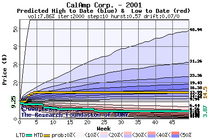 The high to date and low to date prices of the stock plotted against a random walk model for 2001 (what's this?).