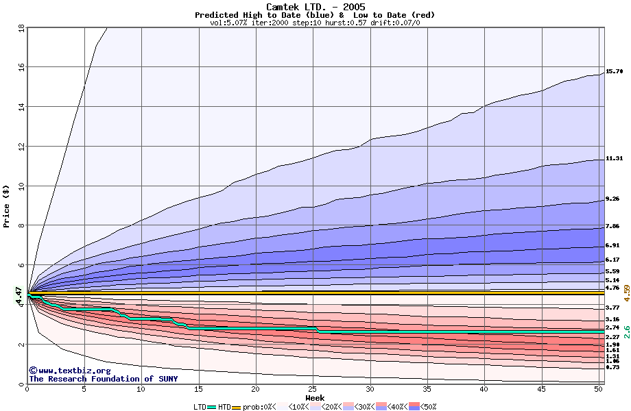 The high to date and low to date prices of the stock plotted against a random walk model for 2005 (what's this?).