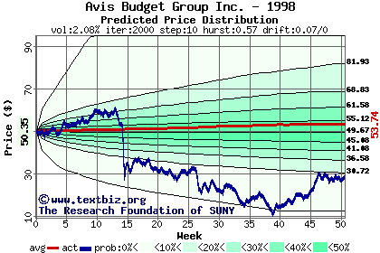 The high to date and low to date prices of the stock plotted against a random walk model for 1998 (what's this?).