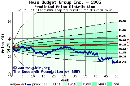 The following graph plots the year-to-date performance of the stock for 2005 compared to the probability calculated by a random walk model.
