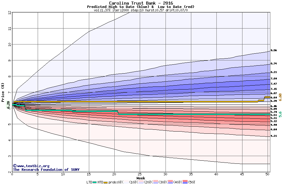 The high to date and low to date prices of the stock plotted against a random walk model for 2016 (what's this?).