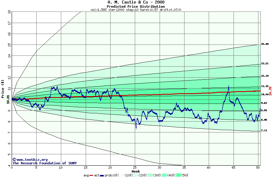 The high to date and low to date prices of the stock plotted against a random walk model for 2000 (what's this?).