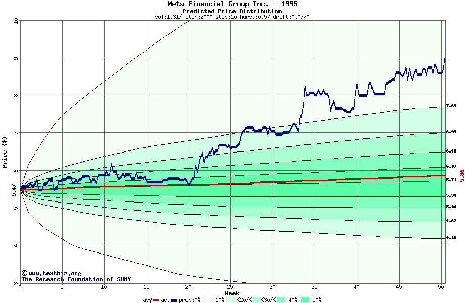 The following graph plots the year-to-date performance of the stock for 1995 compared to the probability calculated by a random walk model.