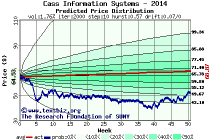 The high to date and low to date prices of the stock plotted against a random walk model for 2014 (what's this?).