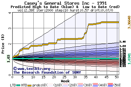 The high to date and low to date prices of the stock plotted against a random walk model for 1991 (what's this?).