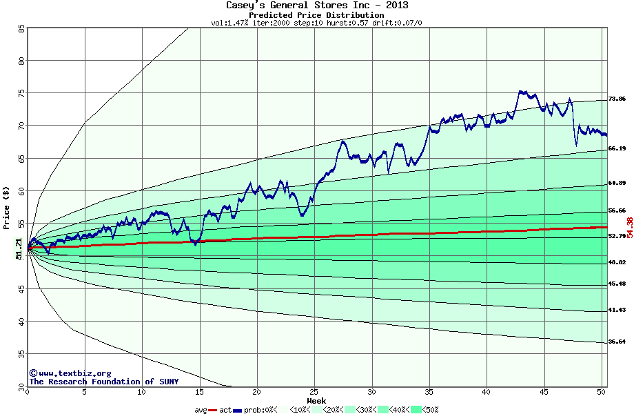 The following graph plots the year-to-date performance of the stock for 2013 compared to the probability calculated by a random walk model.