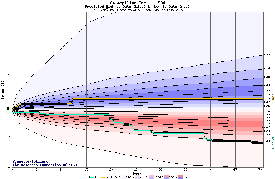 The high to date and low to date prices of the stock plotted against a random walk model for 1984 (what's this?).