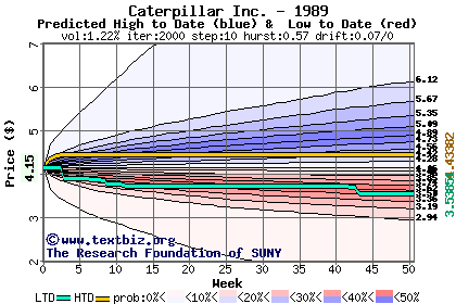 The high to date and low to date prices of the stock plotted against a random walk model for 1989 (what's this?).