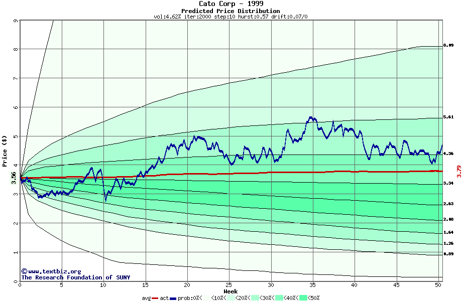 The following graph plots the year-to-date performance of the stock for 1999 compared to the probability calculated by a random walk model.