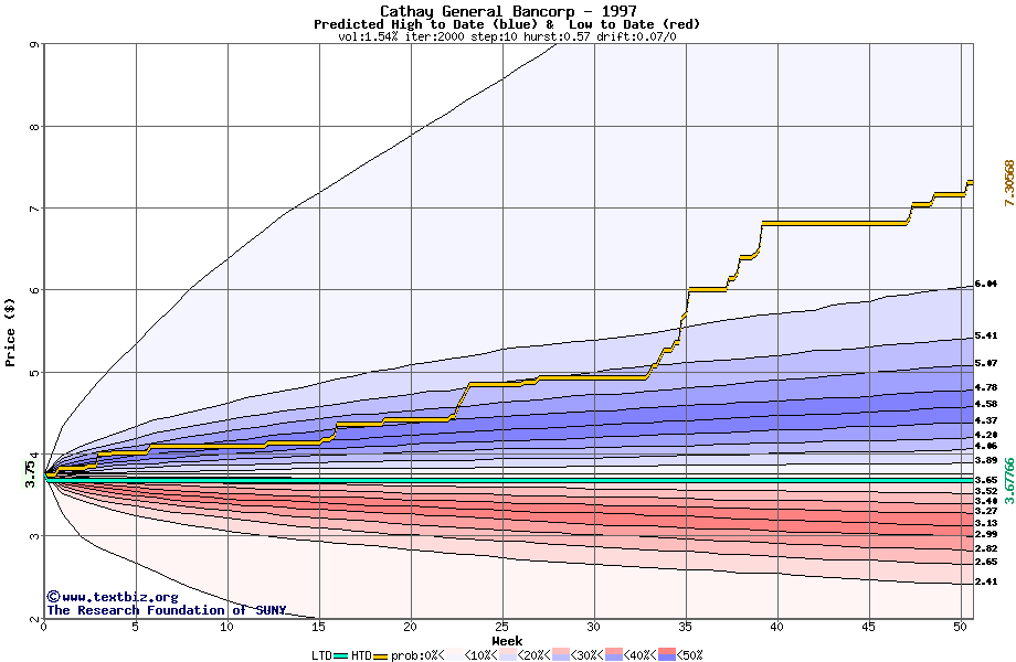 The high to date and low to date prices of the stock plotted against a random walk model for 1997 (what's this?).
