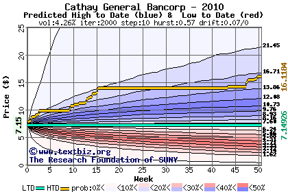 The high to date and low to date prices of the stock plotted against a random walk model for 2010 (what's this?).