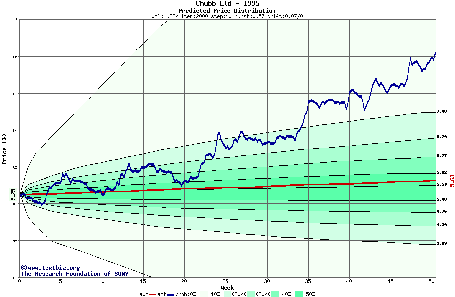 The following graph plots the year-to-date performance of the stock for 1995 compared to the probability calculated by a random walk model.