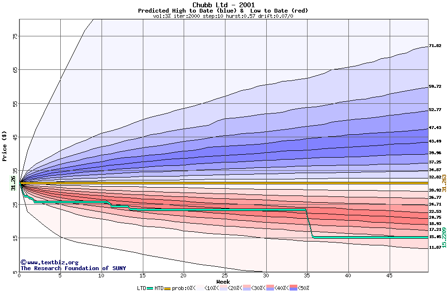 The high to date and low to date prices of the stock plotted against a random walk model for 2001 (what's this?).