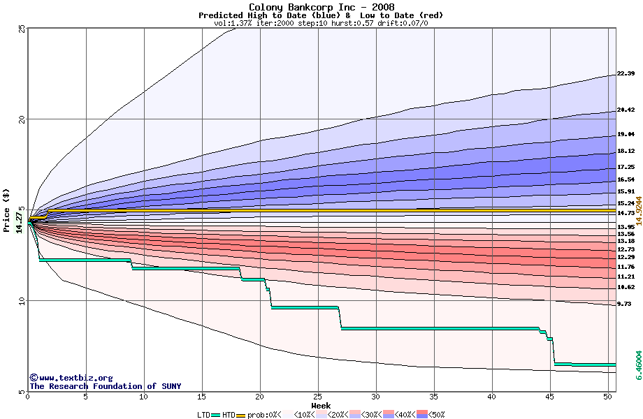 The high to date and low to date prices of the stock plotted against a random walk model for 2008 (what's this?).
