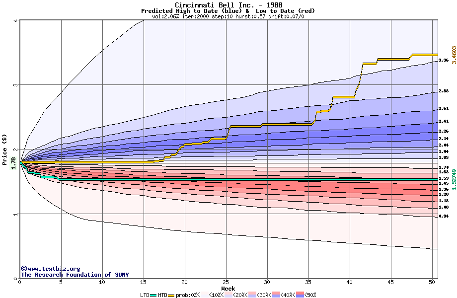 The high to date and low to date prices of the stock plotted against a random walk model for 1988 (what's this?).