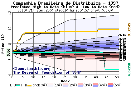 The high to date and low to date prices of the stock plotted against a random walk model for 1997 (what's this?).