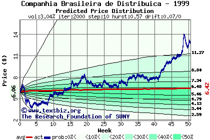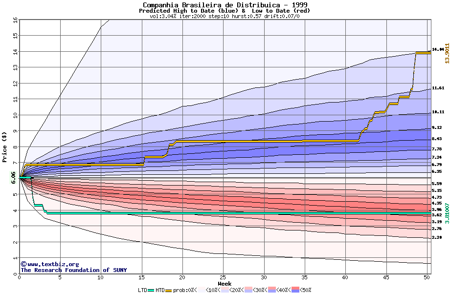 The high to date and low to date prices of the stock plotted against a random walk model for 1999 (what's this?).