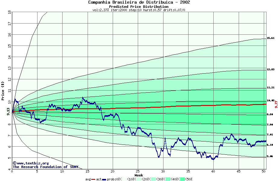 The following graph plots the year-to-date performance of the stock for 2002 compared to the probability calculated by a random walk model.