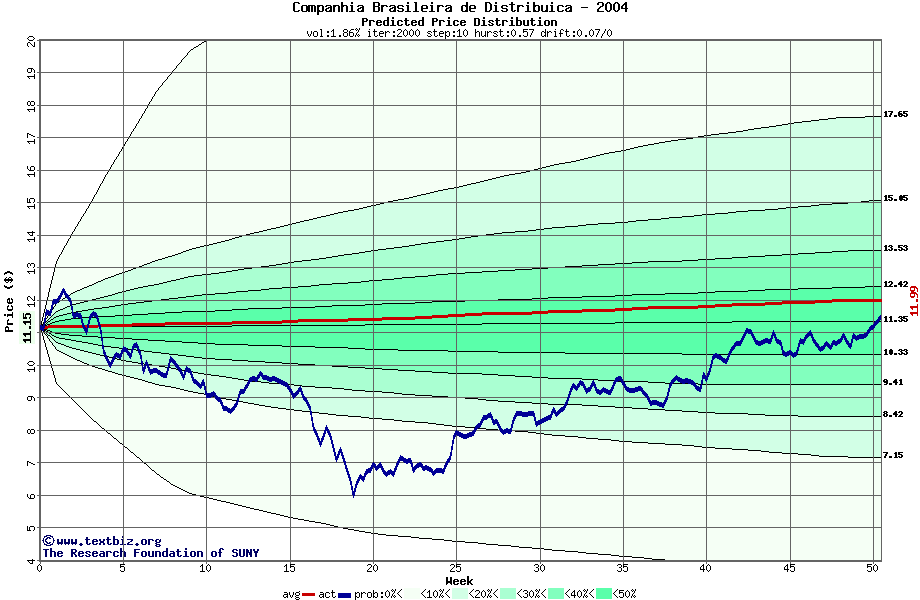 The following graph plots the year-to-date performance of the stock for 2004 compared to the probability calculated by a random walk model.