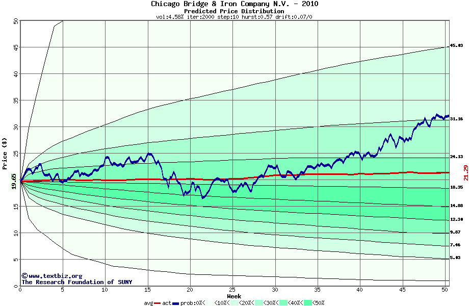 The high to date and low to date prices of the stock plotted against a random walk model for 2010 (what's this?).