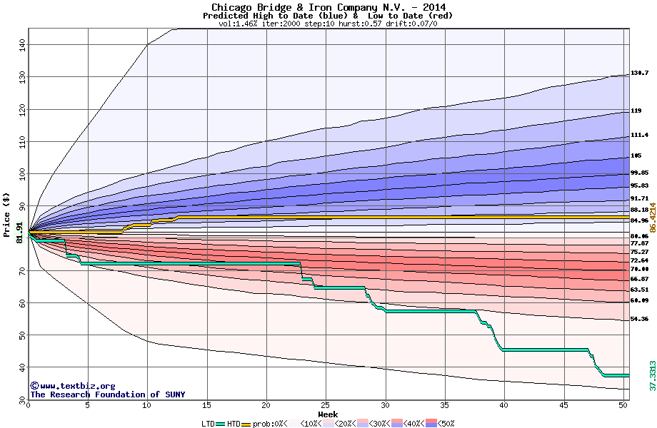 The high to date and low to date prices of the stock plotted against a random walk model for 2014 (what's this?).