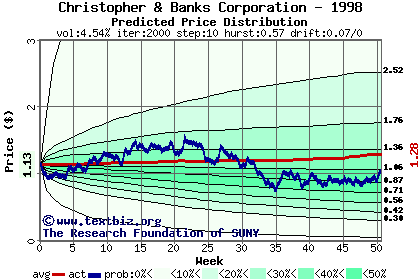 The high to date and low to date prices of the stock plotted against a random walk model for 1998 (what's this?).