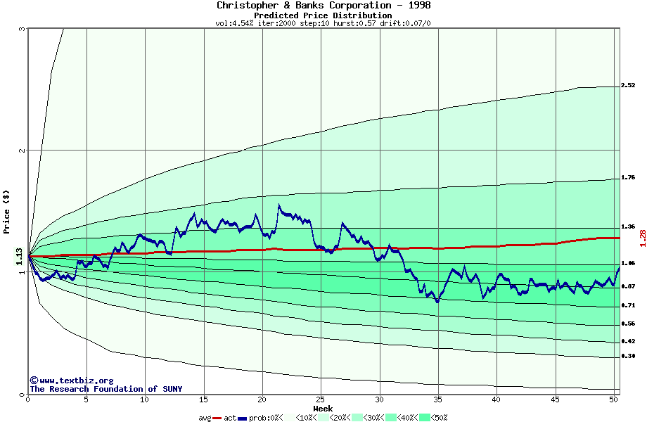 The following graph plots the year-to-date performance of the stock for 1998 compared to the probability calculated by a random walk model.