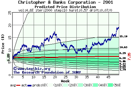 The following graph plots the year-to-date performance of the stock for 2001 compared to the probability calculated by a random walk model.